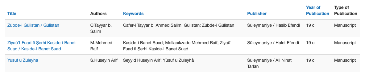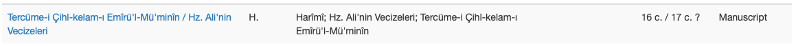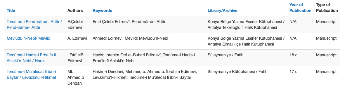 3. Some retranslations produced in the Ottoman period are recorded by century, and not by year, as their years of production are not known. These entries are searchable by century, as in 19 c. or 16 c. / 17 c.